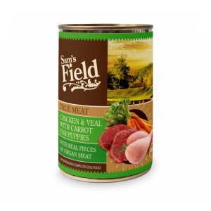 Mokra karma dla szczeniąt – kurczak z cielęciną i marchewką 400g Sam’s Field