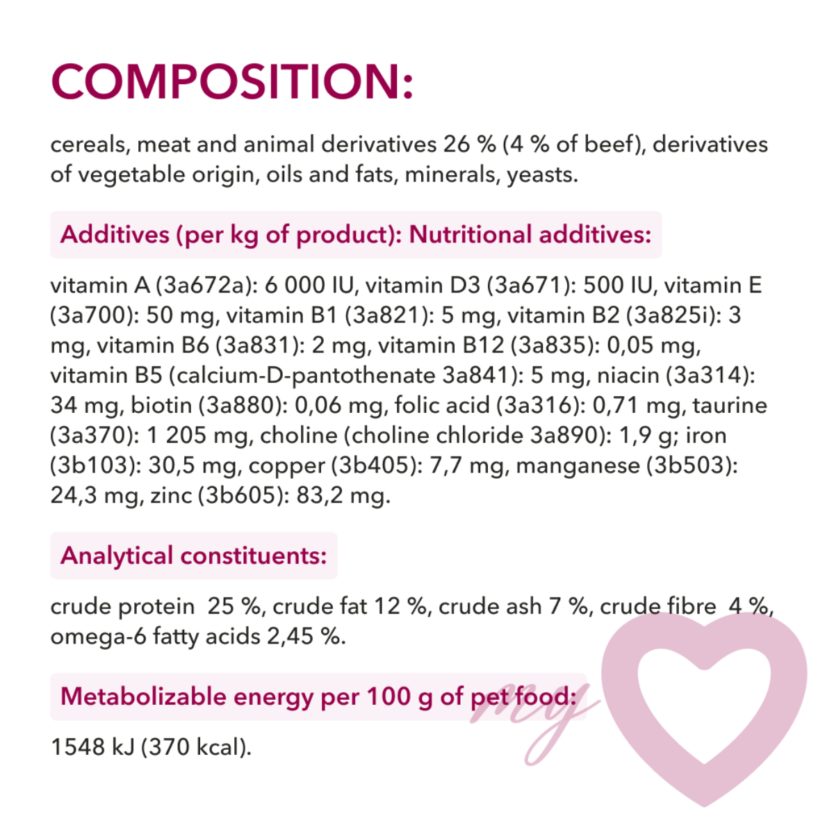 Koty potrzebują tauryny każdego dnia, ponieważ ich organizm nie potrafi wytwarzać jej samodzielnie. Regularne spożywanie karmy My Love zapewnia odpowiednią ilość tauryny, wspierając zdrowy wzrok, serce oraz ogólne funkcje życiowe.