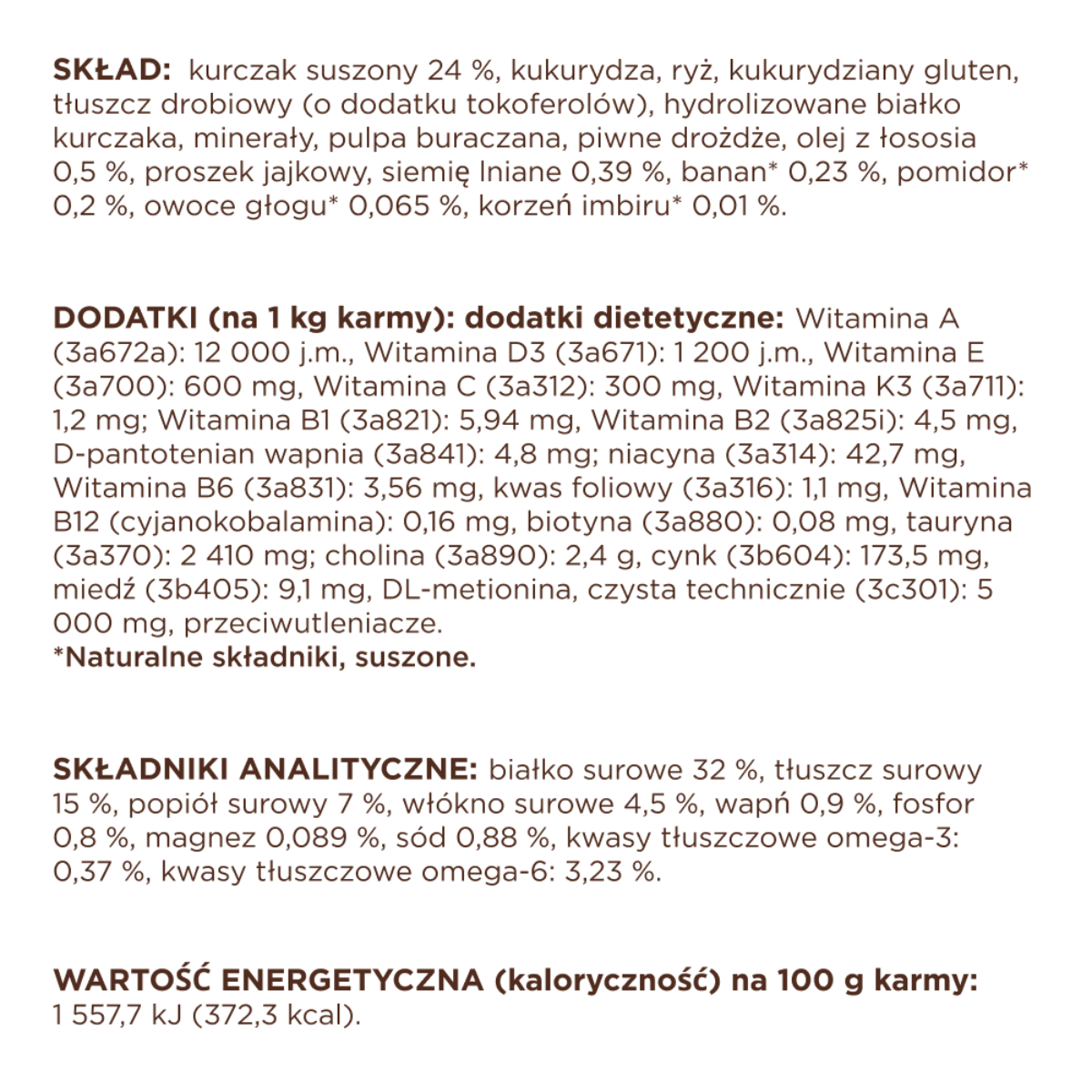 - Pozostałe Kukurydziany gluten Kukurydza Ryż Mączka z łososia 4% Składniki mineralne Pulpa buraczana Celuloza* Piwne drożdże Proszek jajkowy Olej z łososia 0,5% Siemię lniane 0,39% Banan* 0,23% Pomidor* 0,2% Owoce głogu* 0,065% Korzeń imbiru* 0,01%