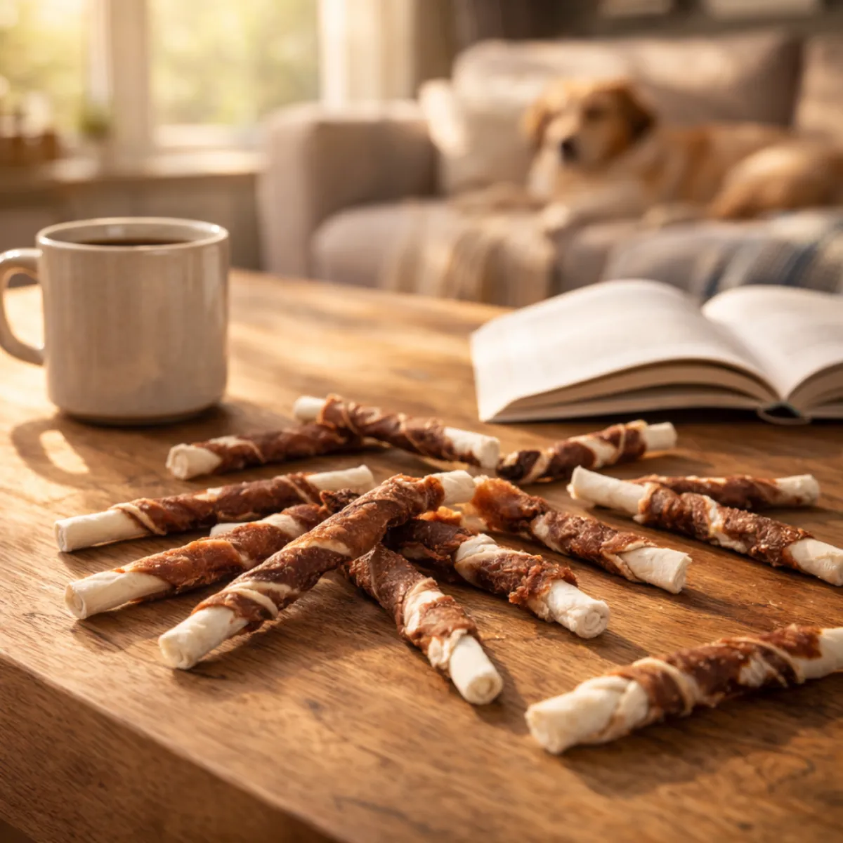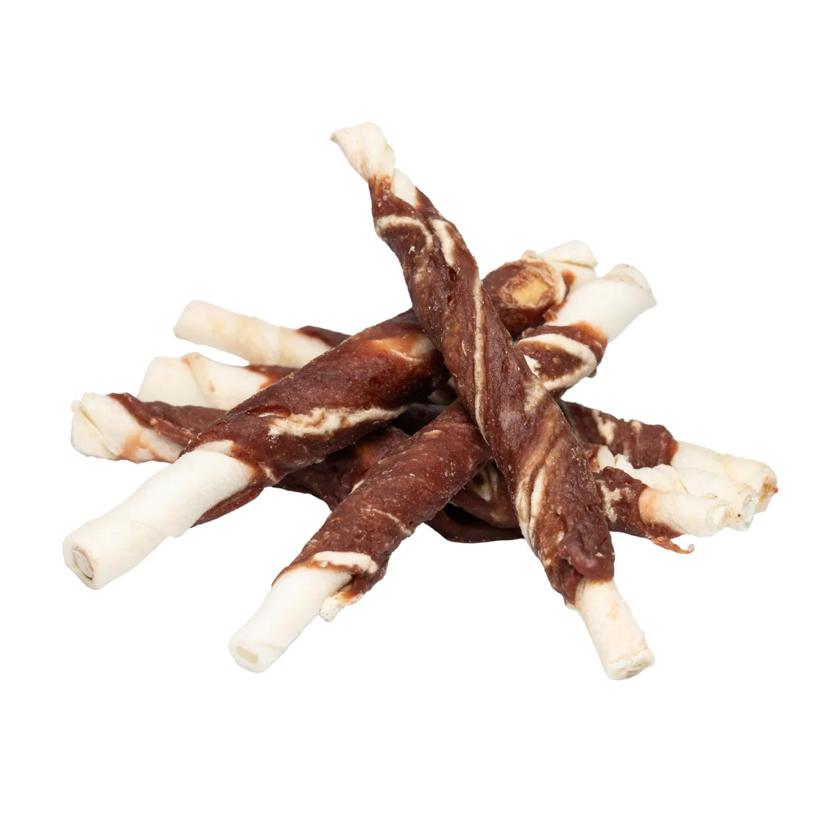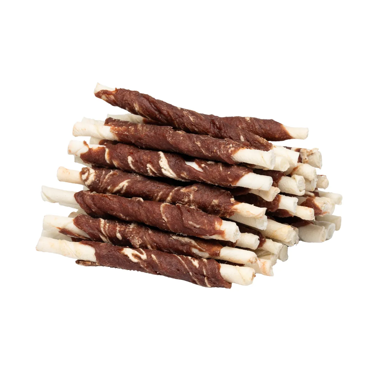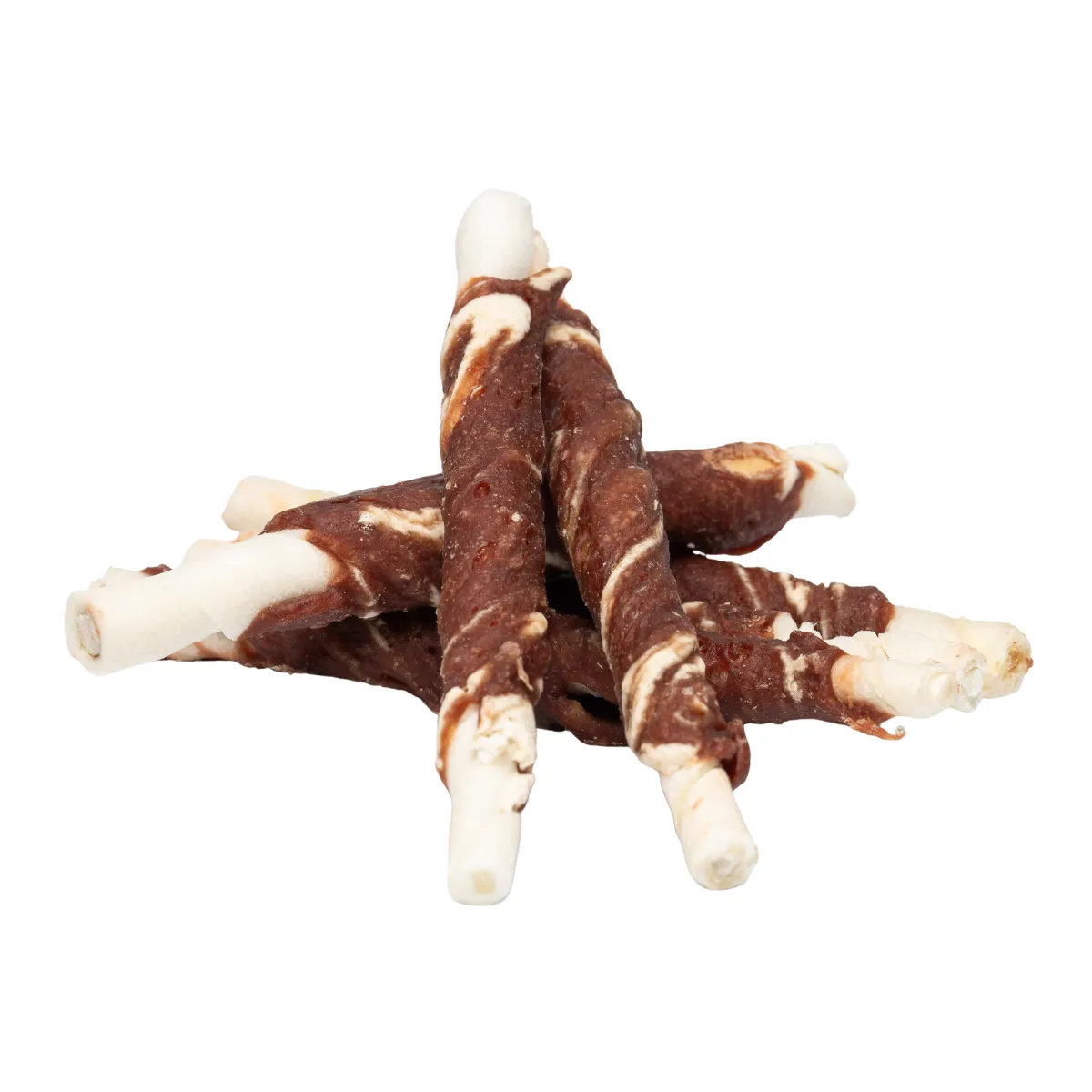 Pałeczki łączą w sobie smakowitą warstwę mięsną z trwałym, twardym rdzeniem. Pies najpierw rozsmakowuje się w otoczce, a następnie przechodzi do intensywnego gryzienia wnętrza. To przysmak, który nie tylko angażuje psa na dłużej, ale też działa antystresowo i wyciszająco. Idealny jako nagroda po spacerze, treningu lub podczas chwil samotności.